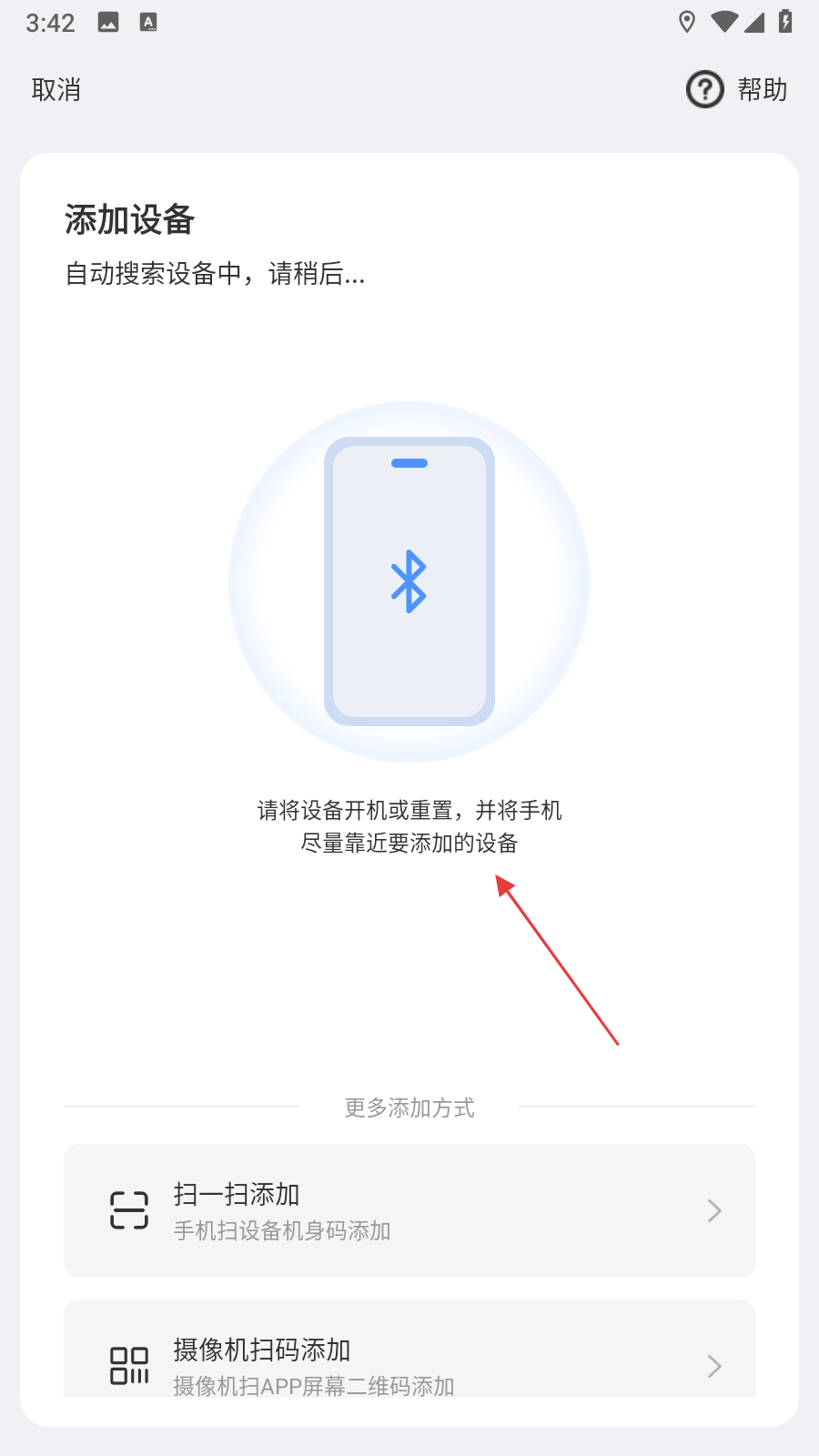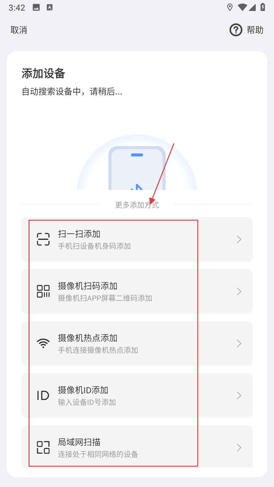 4、若自動(dòng)搜索未找到設(shè)備,可點(diǎn)擊更多添加方式,選擇掃一掃添加,攝像機(jī)掃碼添加等方式。