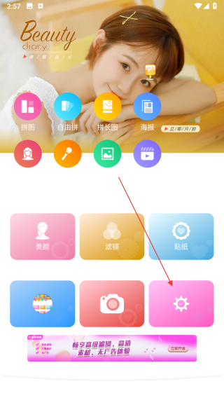 1、打開美顏輕拍相機APP,在主界面點擊粉色齒輪形狀的設(shè)置按鈕,進入設(shè)置相關(guān)頁面。