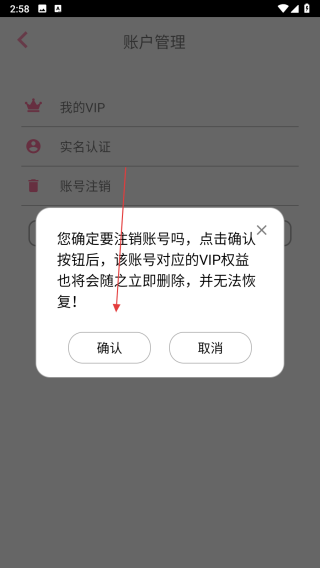 4、在賬戶管理頁面,點擊賬號注銷選項,彈出確認注銷的對話框后,點擊確認按鈕,即可提交賬號注銷申請。