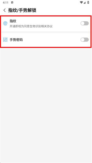 5、在指紋手勢解鎖頁面,按需開啟指紋或手勢密碼開關(guān),即可完成密碼保護(hù)設(shè)置。