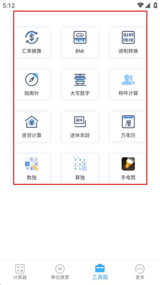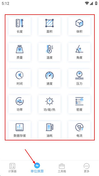 2、在工具箱頁面瀏覽各類工具,點(diǎn)擊底部單位換算選項(xiàng)切換至對應(yīng)頁面。