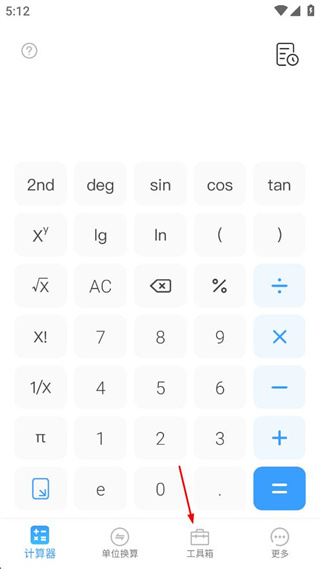 1、打開多功能計(jì)算器軟件,進(jìn)入計(jì)算器主界面,點(diǎn)擊底部工具箱選項(xiàng)查看功能。