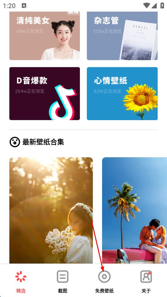 1、打開壁紙軟件,點擊底部“免費壁紙”選項,進入免費壁紙頁面。