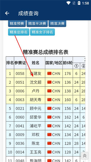 4、能看到該賽事對應(yīng)的成績排名表,表中會顯示參賽證號、選手姓名、成績等詳細(xì)信息。