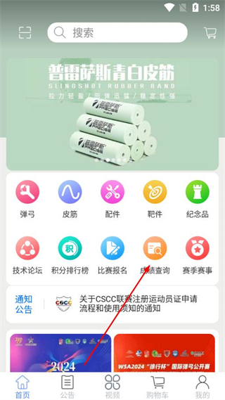 1、打開CSCC彈弓app的首頁,在功能選項區(qū)域中找到成績查詢?nèi)肟诓Ⅻc擊進(jìn)入。