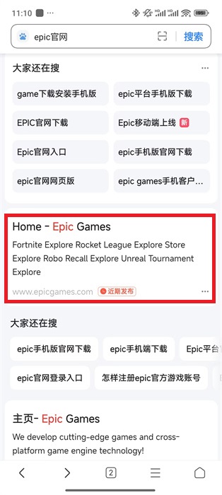 1、打開手機瀏覽器,搜索【epic Games】然后在搜索結(jié)果中找到【Home epic Games】點擊打開;