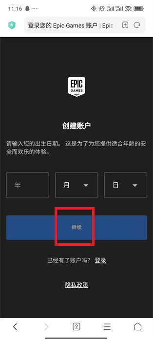 5、在創(chuàng)建賬戶界面,需要填寫自己的【出生日期】,只要超過十八歲就可以,填寫好之后點擊【繼續(xù)】即可;