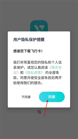 1、打開飛行卡應用,出現(xiàn)用戶隱私保護提醒彈窗,閱讀服務協(xié)議和隱私政策內容后,點擊同意按鈕進入應用。