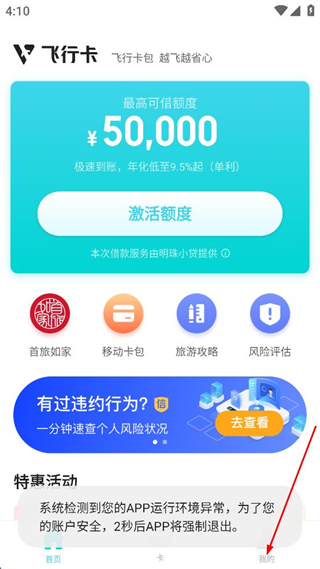 2、進入飛行卡首頁,瀏覽頁面展示的服務信息,找到頁面底部的我的選項,點擊該選項進入對應的個人頁面。