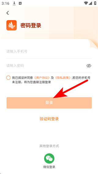 4、輸入手機號和密碼,勾選協(xié)議后點擊登錄,完成賬號登錄操作。