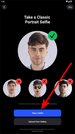 2、在提示拍攝經(jīng)典人像自拍的界面,你可以選擇點(diǎn)擊Take a Selfie直接自拍,或者點(diǎn)擊Upload from Gallery從相冊上傳照片。