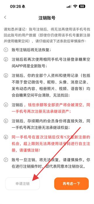 4、在注銷賬號頁面,仔細閱讀注銷條款后,點擊申請注銷按鈕,即可完成賬號注銷操作。