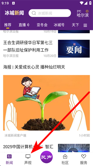 1、打開冰城新聞APP,點擊底部聲視,進入聲視的頁面。