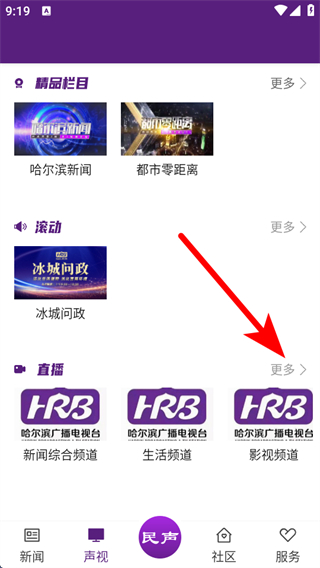 2、在聲視頁面,找到直播板塊,點擊更多進入看電視頁面。