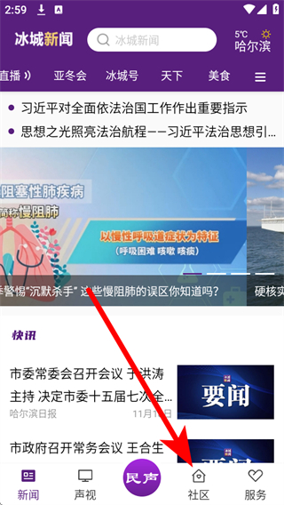 1、打開冰城新聞APP,點擊底部導航欄的社區(qū)選項,進入社區(qū)頁面。