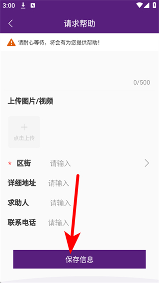 4、信息填寫完成后,點擊保存信息按鈕,即可提交請求幫助的申請。