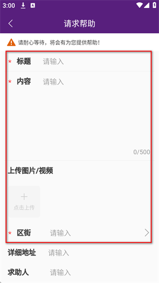 3、在請求幫助頁面,填寫標題、內(nèi)容、上傳圖片/視頻、區(qū)街、詳細地址、求助人、聯(lián)系電話等信息。