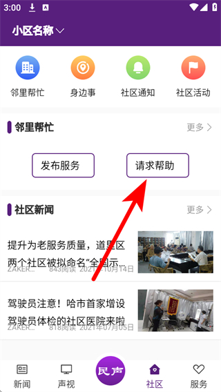 2、在社區(qū)頁面中,點擊請求幫助按鈕,進入請求幫助頁面。