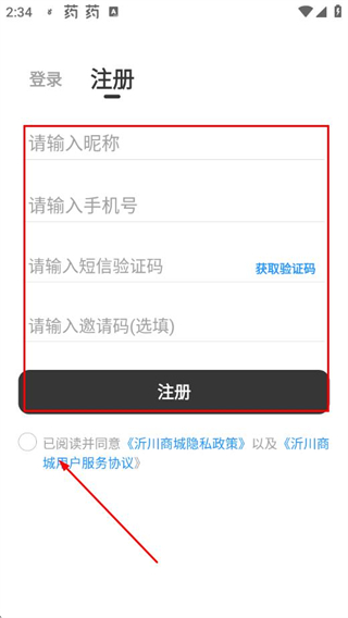 2、在注冊頁面填寫昵稱、手機(jī)號,獲取并輸入短信驗證碼,邀請碼選填。