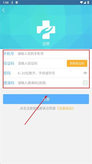 3、輸入手機(jī)號、驗(yàn)證碼、密碼,邀請碼為選填項(xiàng),點(diǎn)擊注冊按鈕。
