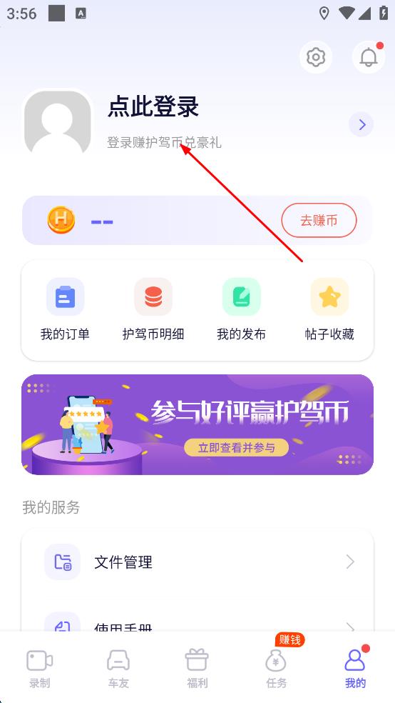 1、打開護駕行車記錄儀軟件,進入主界面后,點擊底部“我的”選項,進入個人中心頁面,進行登錄。
