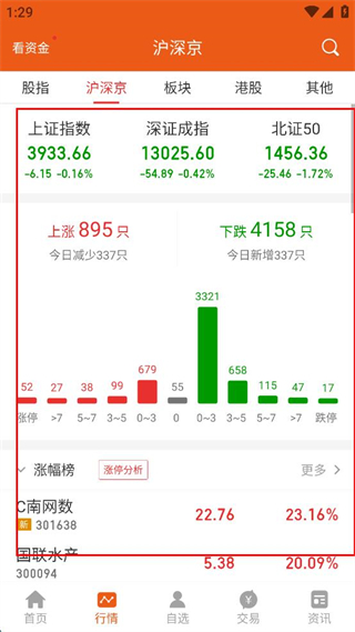4、登錄后進(jìn)入行情界面,可查看滬深京等股指數(shù)據(jù)及漲跌個(gè)股情況。