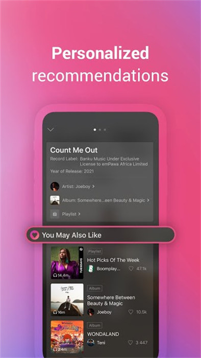 Boomplay是音樂之鄉(xiāng),擁有超過5000萬首您喜歡的歌手在不同流派中播放的歌曲。在Boomplay上免費流式傳輸和下載流行歌曲,新發(fā)行的唱片,專輯和精選的播放列表,并免費離線播放它們!