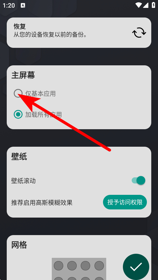 1、在設(shè)置頁面,點擊主屏幕下的僅基本應(yīng)用選項,選中該設(shè)置。