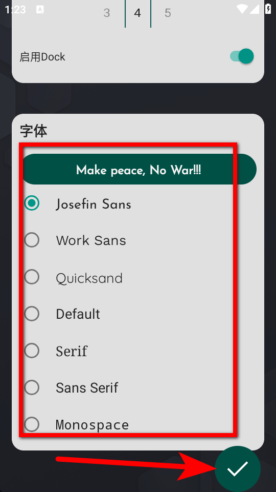 3、在字體設(shè)置區(qū)域,選擇想要的字體如JosefinSans后,點擊右下角對勾按鈕。
