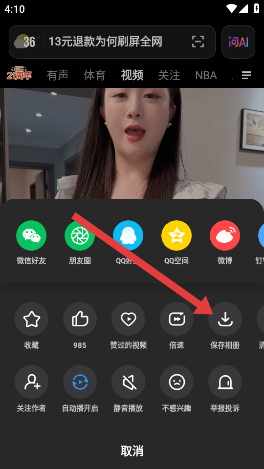 2、在視頻播放的界面中,需要長按視頻調(diào)出功能菜單并點擊保存相冊按鈕,啟動視頻下載流程。