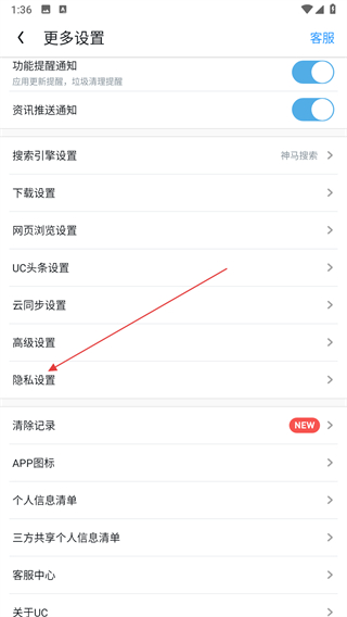 3、進(jìn)入更多設(shè)置頁面后,點擊隱私設(shè)置選項。