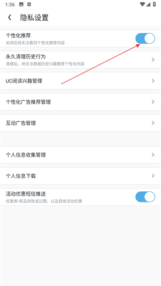 4、點擊個性化推薦開關(guān)按鈕,將其關(guān)閉即可。