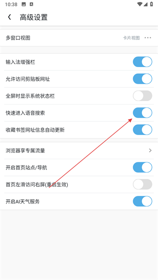 4、找到快速進(jìn)入語音搜索對應(yīng)的開關(guān),點擊開啟即可啟用該功能。