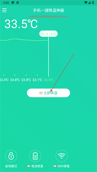 1、打開手機(jī)一鍵降溫神器APP,進(jìn)入主界面查看當(dāng)前手機(jī)溫度,點(diǎn)擊立即降溫按鈕。