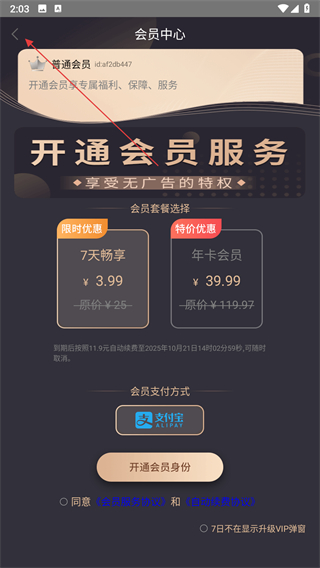 2、點(diǎn)擊之后會(huì)彈出會(huì)員開通的提示,點(diǎn)擊左上角的退出箭頭返回上個(gè)界面。