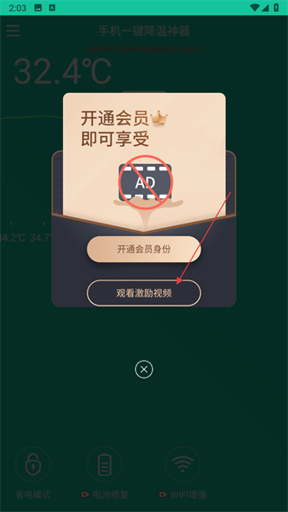 3、返回之后出現(xiàn)彈窗,點(diǎn)擊觀看激勵(lì)視頻,無需開通會(huì)員即可繼續(xù)使用降溫功能。