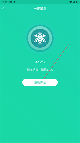 4、觀看完后,APP自動(dòng)對(duì)手機(jī)溫度進(jìn)行掃描并執(zhí)行降溫操作,點(diǎn)擊重新降溫按鈕即可再次降溫。