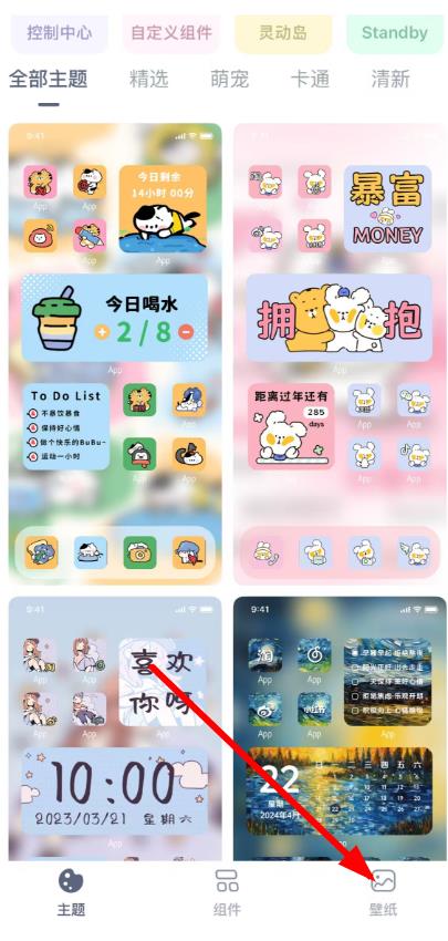 1、打開(kāi)主題壁紙大全應(yīng)用,點(diǎn)擊底部壁紙選項(xiàng)進(jìn)入相關(guān)界面。