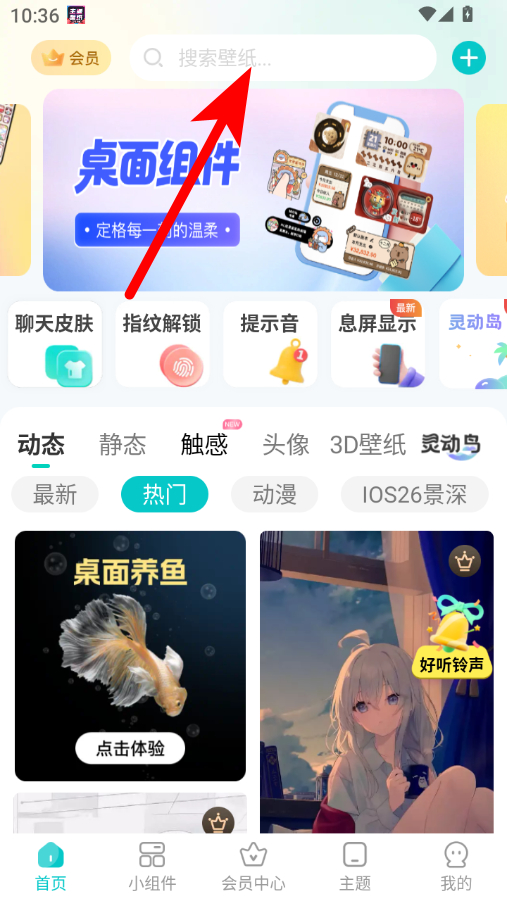 1、在主題壁紙大全首頁(yè),點(diǎn)擊頂部搜索框,進(jìn)入搜索界面。