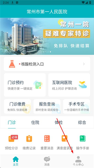 1、打開(kāi)常州一院APP,點(diǎn)擊右下角的個(gè)人中心。
