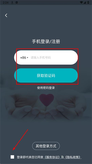 3、在手機(jī)登錄/注冊(cè)頁(yè)面,勾選服務(wù)協(xié)議,輸入手機(jī)號(hào)碼,輸入驗(yàn)證碼完成注冊(cè)。