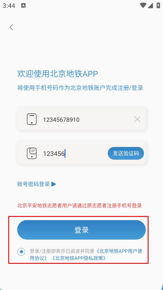 4、勾選同意協(xié)議,北京地鐵APP隱私政策,然后點擊“登錄”按鈕。