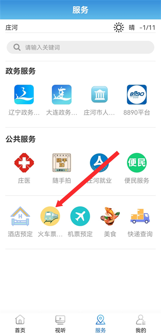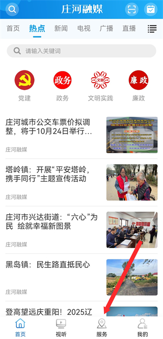 1、打開莊河融媒app,點擊底部服務(wù)的按鈕,進入服務(wù)的頁面。