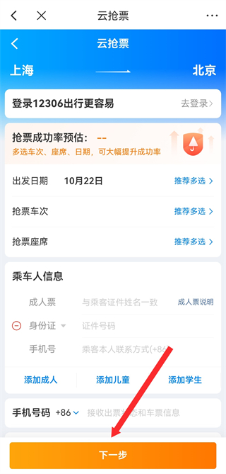 4、在云搶票界面,填寫信息完成后點擊下一步,按照提示完成搶票操作。