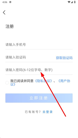 4、在注冊頁面,輸入手機(jī)號、驗(yàn)證碼和密碼,勾選相關(guān)協(xié)議后,點(diǎn)擊立即注冊即可完成賬號注冊。