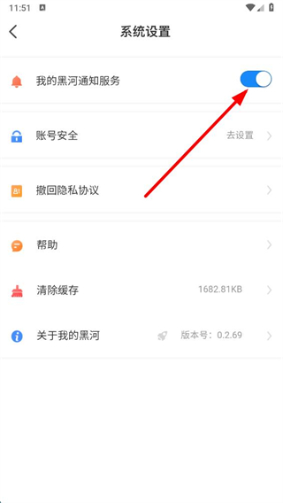 3、在系統(tǒng)設(shè)置界面,找到我的黑河通知服務(wù)選項(xiàng),點(diǎn)擊其右側(cè)的開關(guān)按鈕,即可關(guān)閉通知功能。