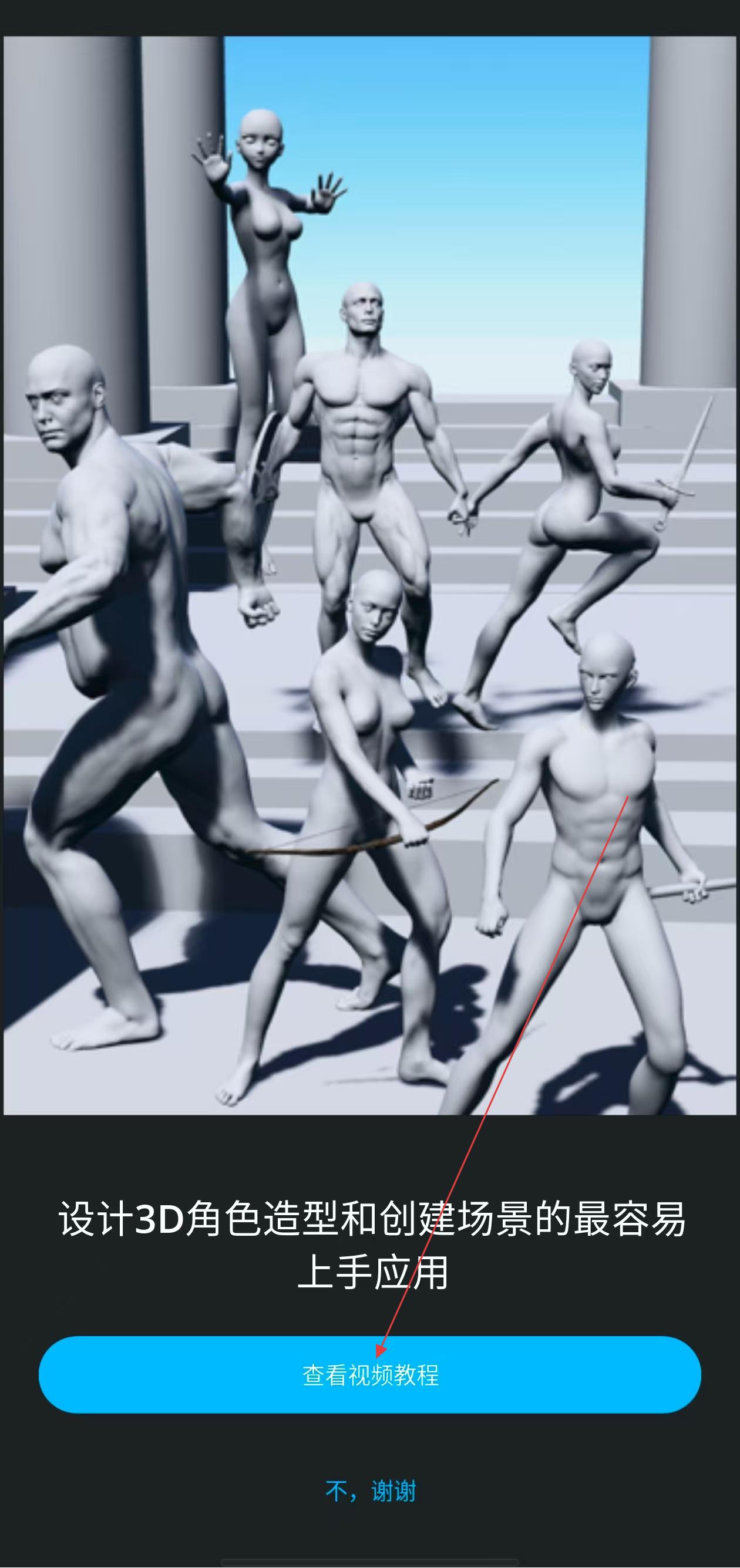 3、點(diǎn)擊我是新用戶后,進(jìn)入引導(dǎo)界面,下方有查看視頻教程按鈕,點(diǎn)擊它即可觀看視頻教程,了解如何設(shè)計(jì)3D角色造型和創(chuàng)建場(chǎng)景等操作。