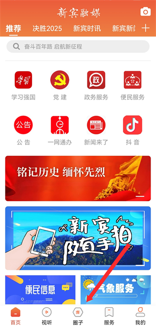 1、打開新賓融媒APP首頁,點(diǎn)擊底部圈子,進(jìn)入圈子的頁面。