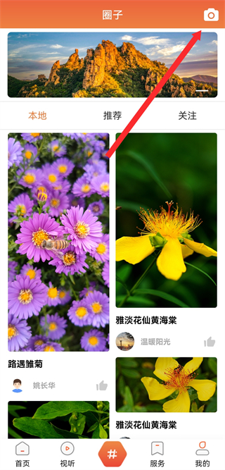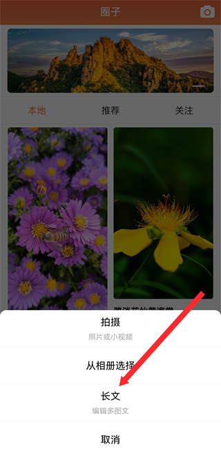 2、在圈子的頁面,點(diǎn)擊右上角相機(jī)圖標(biāo),彈出發(fā)布類型選擇框。
