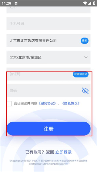 3、點(diǎn)擊獲取驗(yàn)證碼并填入,設(shè)置密碼,勾選協(xié)議,點(diǎn)擊注冊(cè),即可完成注冊(cè)。